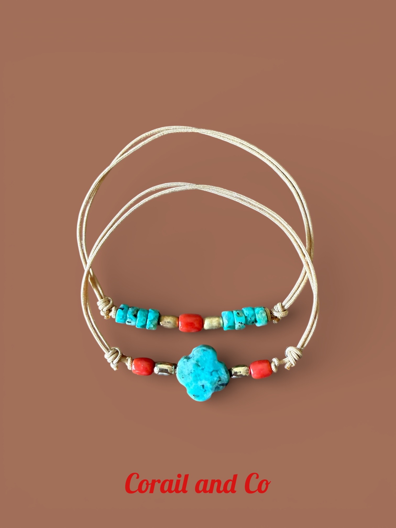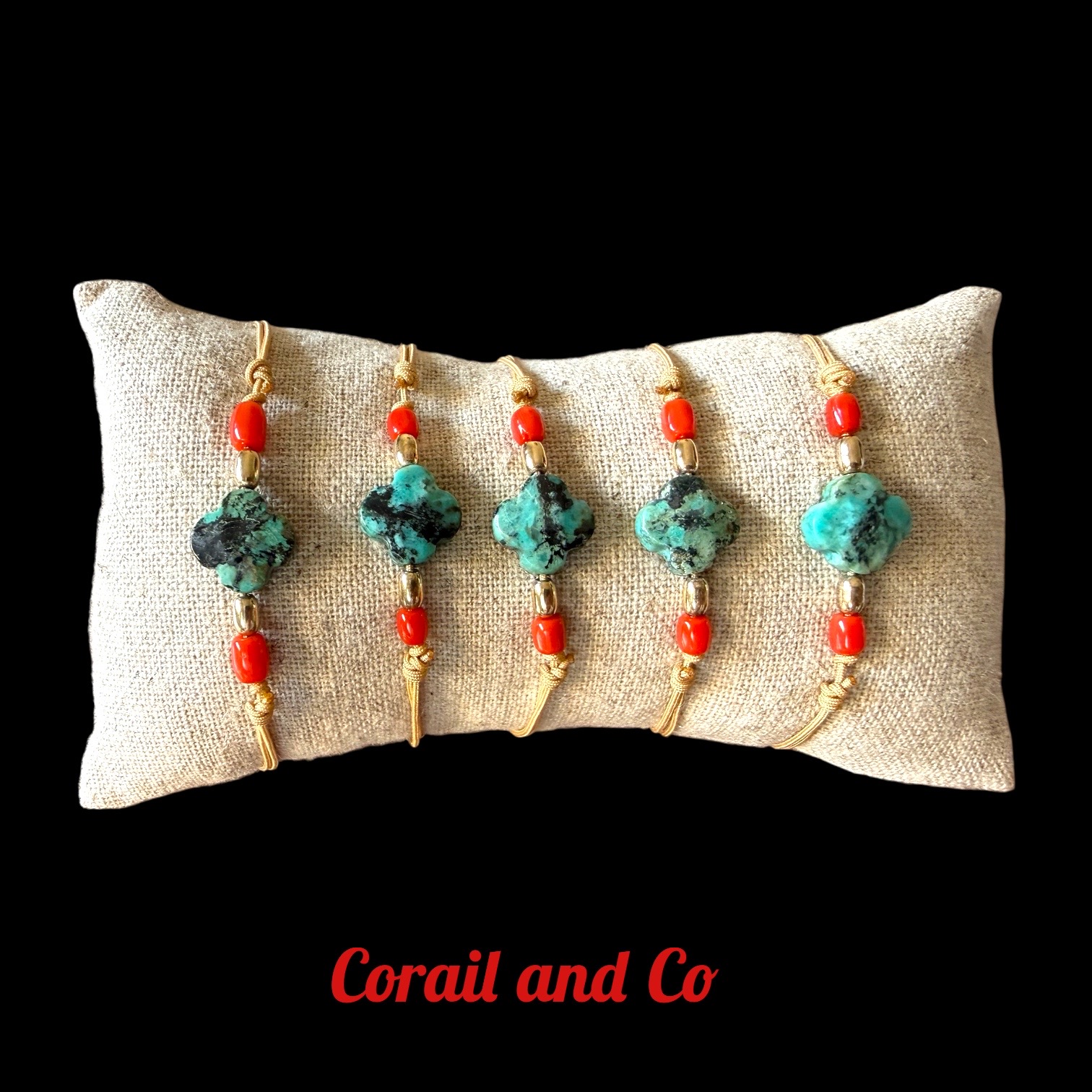 Bracelet femme corail / trèfle en turquoise / plaqué or