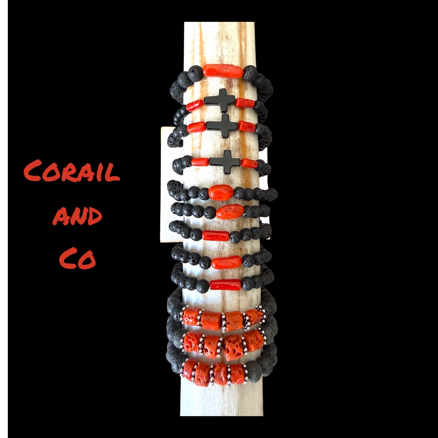 Découvrez ce magnifique bracelet en perles naturelles de lave de 4mm orné d'un gros tube de Corail rouge de Méditerranée au centre ( tube mesurant 1,5 cm de long et 0,5 mm de large Si vous aimez le...