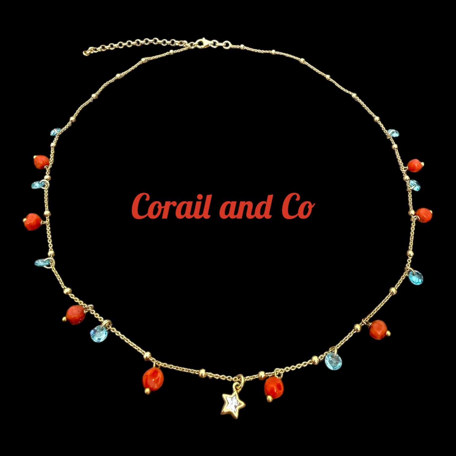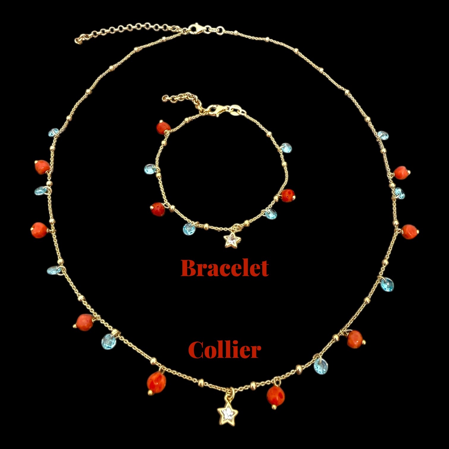 Apportez une touche d'élégance à votre tenue avec le collier plaqué or, une pièce maîtresse de la collection « Les Pampilles de Corail and Co ». Ce collier délicat est conçu avec une chaîne fine en plaqué or, sublimée par des papilles de corail et des pierres semi-précieuses d'une magnifique couleur turquoise. Une petite étoile en pierre semi-précieuse ajoute une touche de magie à l'ensemble.