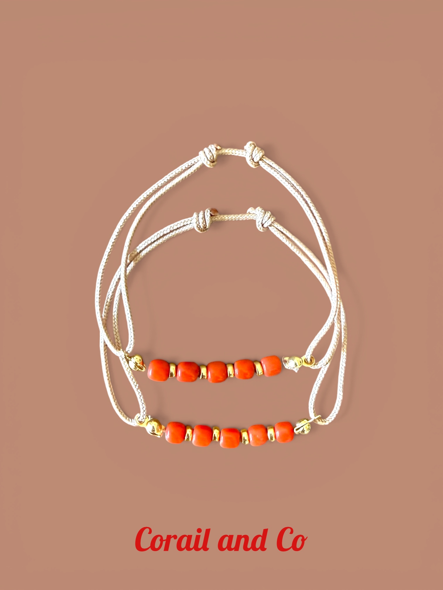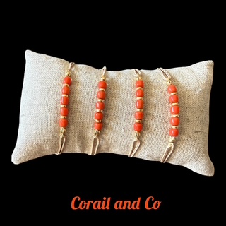 Ce bijou monté sur cordon beige , se compose de perles en corail rouge de Méditerranée ainsi que de rondelles en plaqué or pour un mariage magnifique.